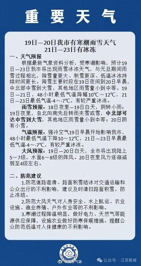 据南京气象:19日-23日将出现雨雪冰冻天气,比元旦期间降雪量更大、积雪更深!19日夜里中北部可达小雪到大雪