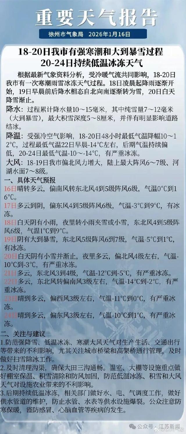 18-20日徐州市有强寒潮和大到暴雪过程